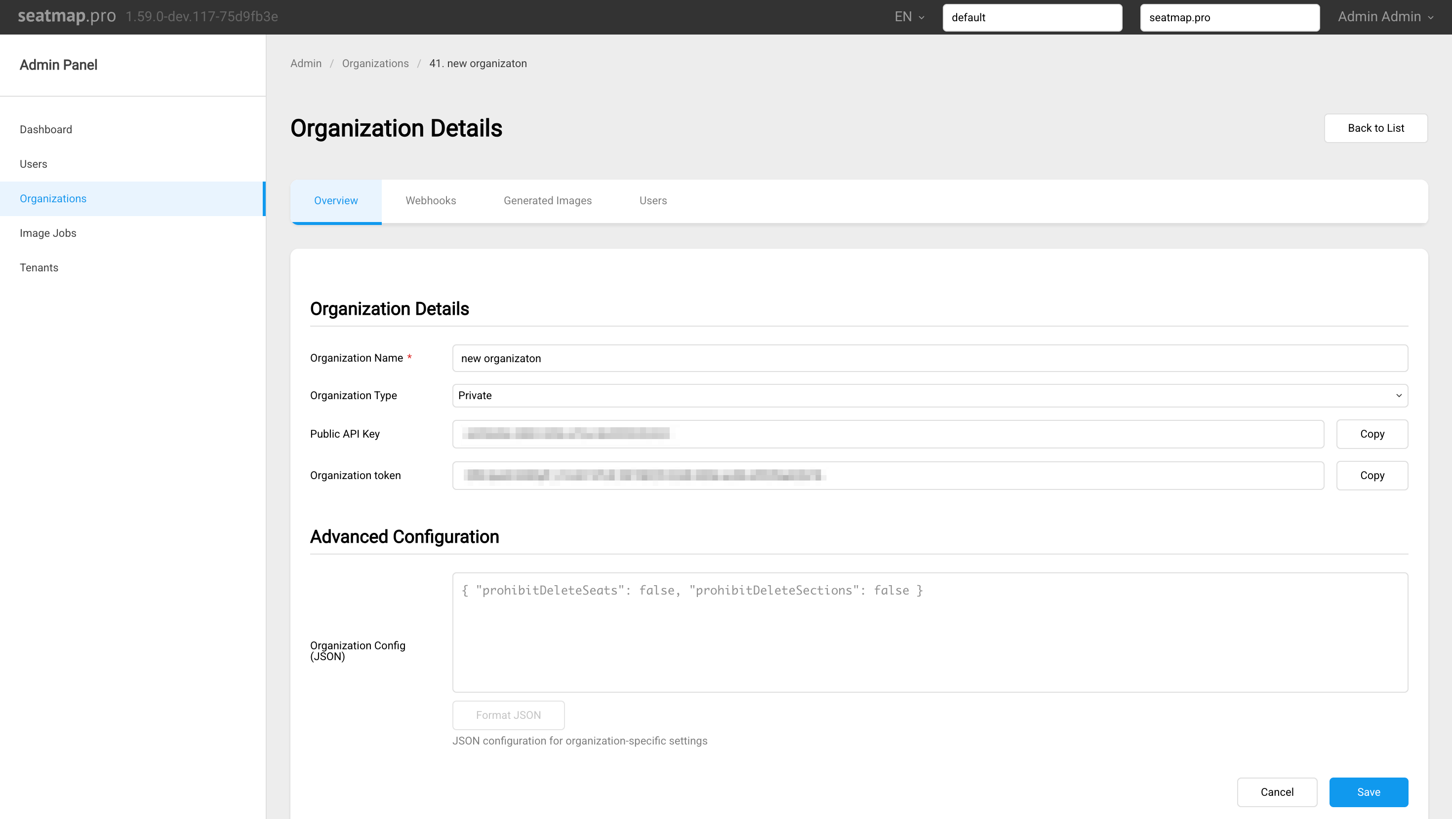 - public API key and organization token are copied from organization settings