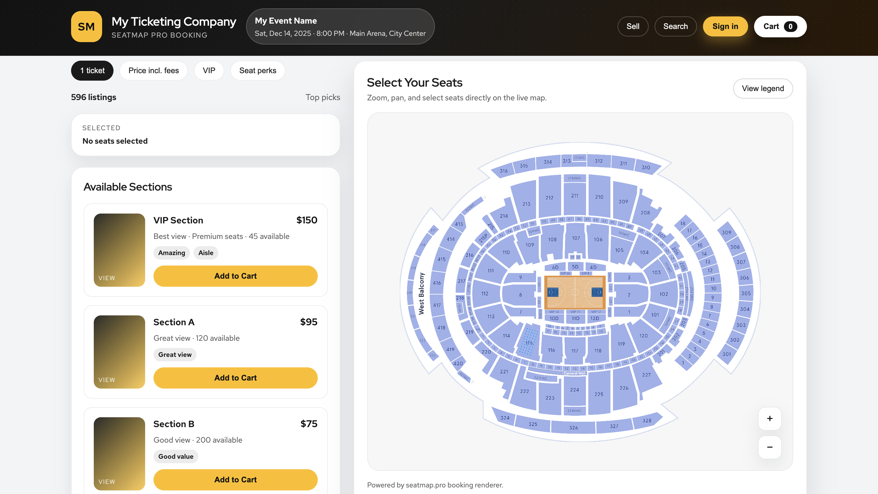 - selling page renders the chart and seat interactions work