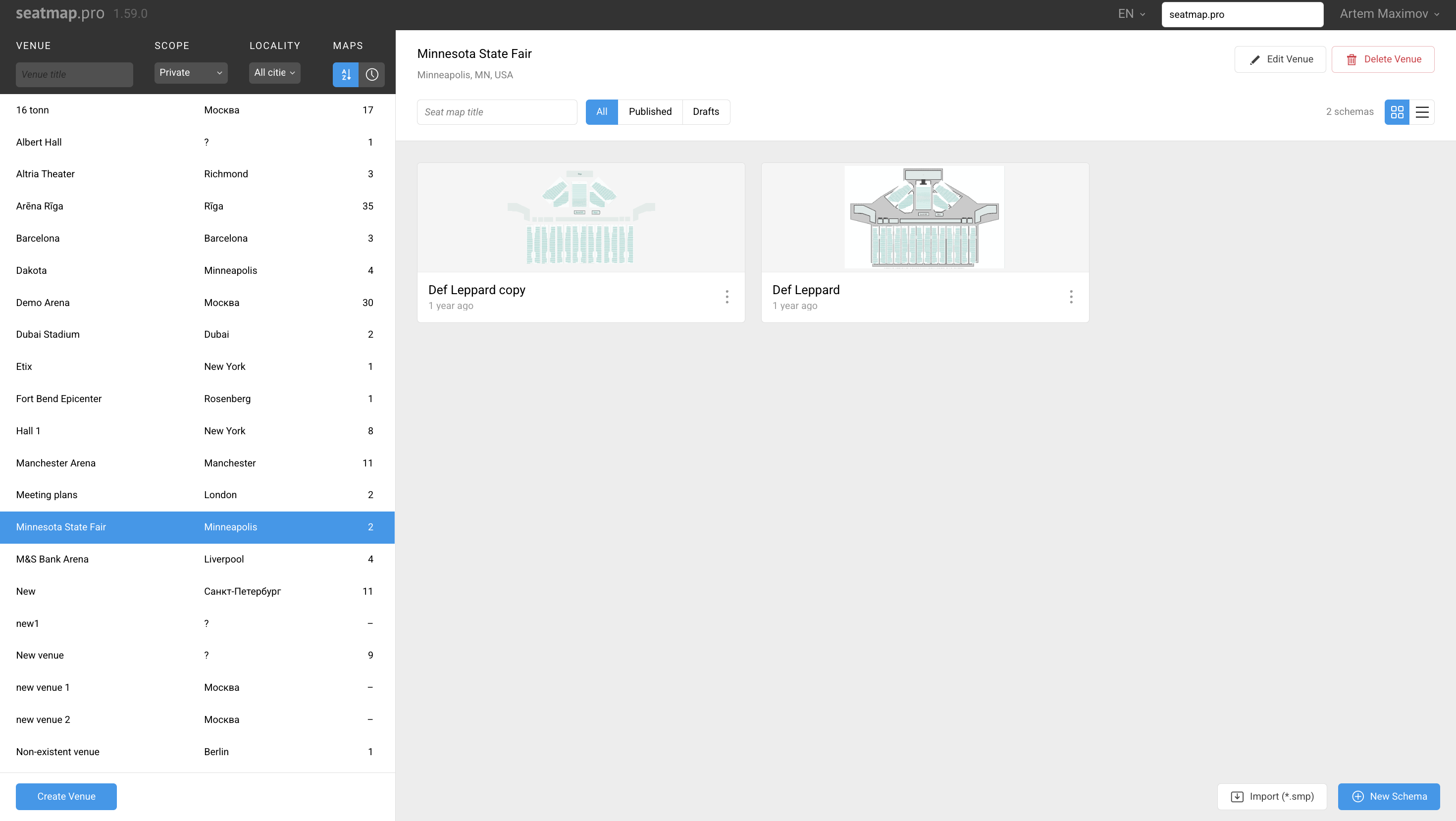 - Open the venue list after login and select an existing venue or create a new one.